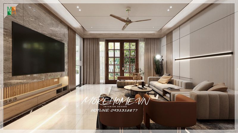 Thiết kế phòng khách biệt thự hiện đại với nội thất gỗ tự nhiên cao cấp, sang trọng