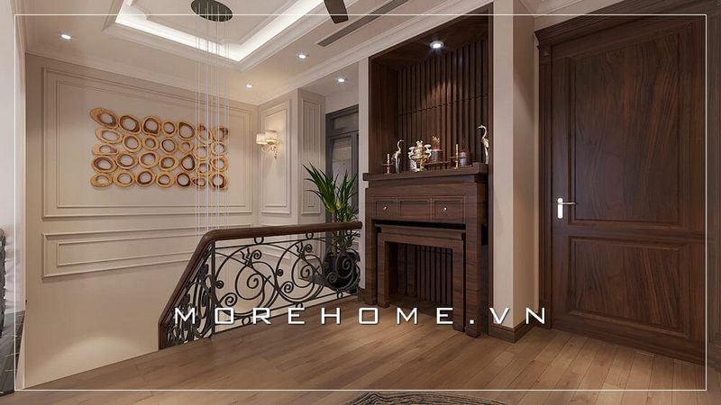Bàn thờ gỗ óc chó tân cổ điển được chạm khắc tinh tế màu nâu trầm cao cấp thể hiện dự tôn nghiêm trong không gian phòng thờ của biệt thự, nhà phố