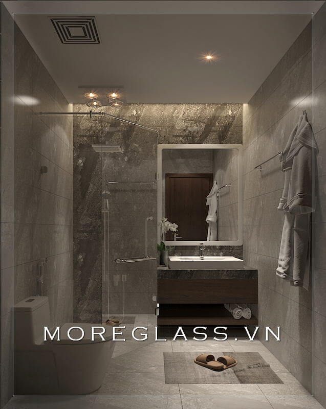 Mẫu thiết kế nội thất phòng tắm hiện đại với gam màu xám chủ đạo, nổi bật với bức tường ốp đá tự nhiên sang trọng cuốn hút mọi ánh nhìn.