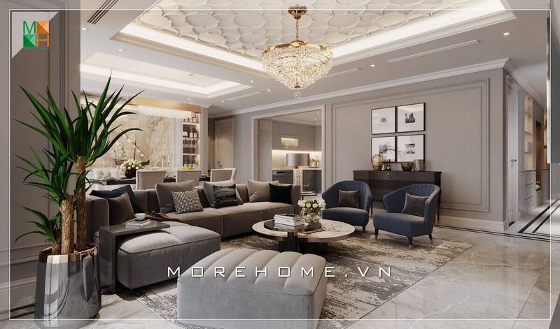 Thiết kế phòng khách chung cư mang phong cách tân cổ điển pha chút hiện đại của nội thất căn hộ tạo nên một phong cách thiết kế đẹp, lạ.