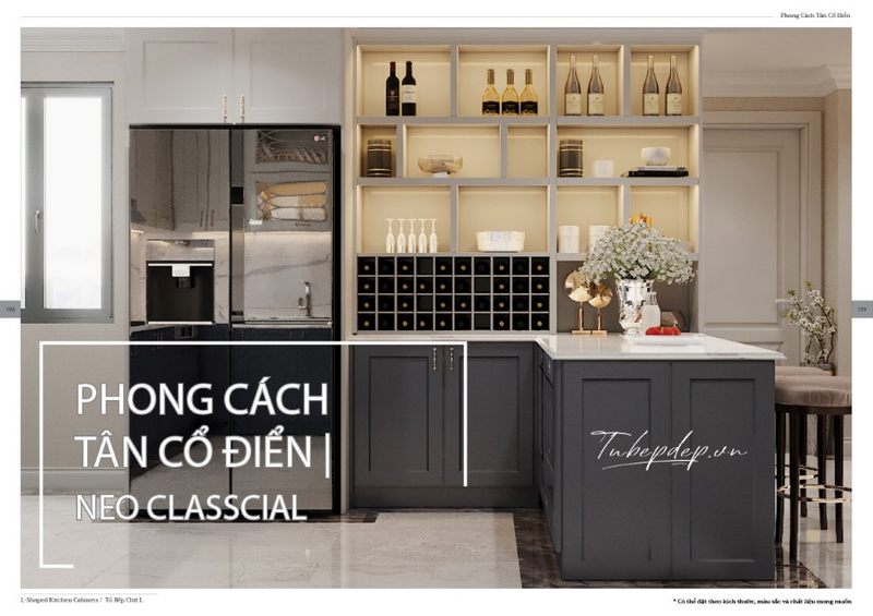 Phong cách tân cổ điển tạo nên mẫu tủ bếp màu xám xanh vừa đủ để tạo vẻ đẹp vừa tăng sự tiện nghi cho không gian nội trợ của căn hộ