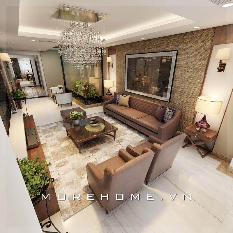 Mẫu thiết kế phòng khách của căn hộ hiện đại được nâng cao bởi bộ sofa bọc da cao cấp, tạo nên điểm nhấn nổi bật cho phòng.