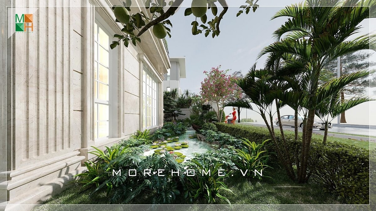 Thiết kế tổng thể biệt thự, nhà phố phong cách tân cổ điển đẹp cao cấp, tinh tế với khoảng sân vườn rộng nhiều cây xanh.